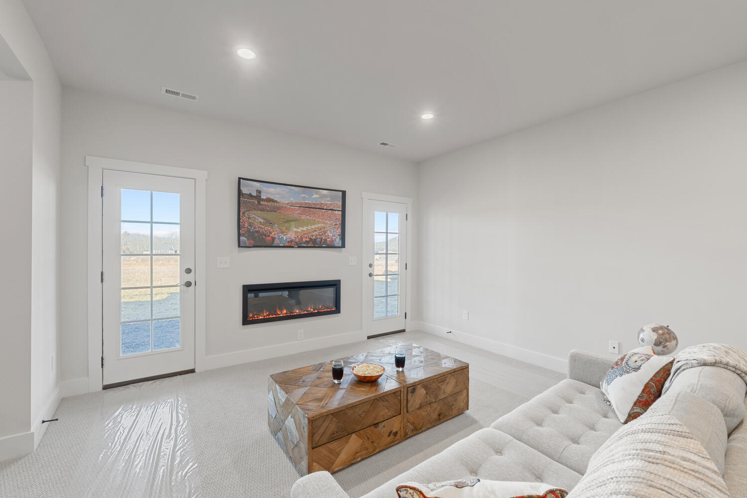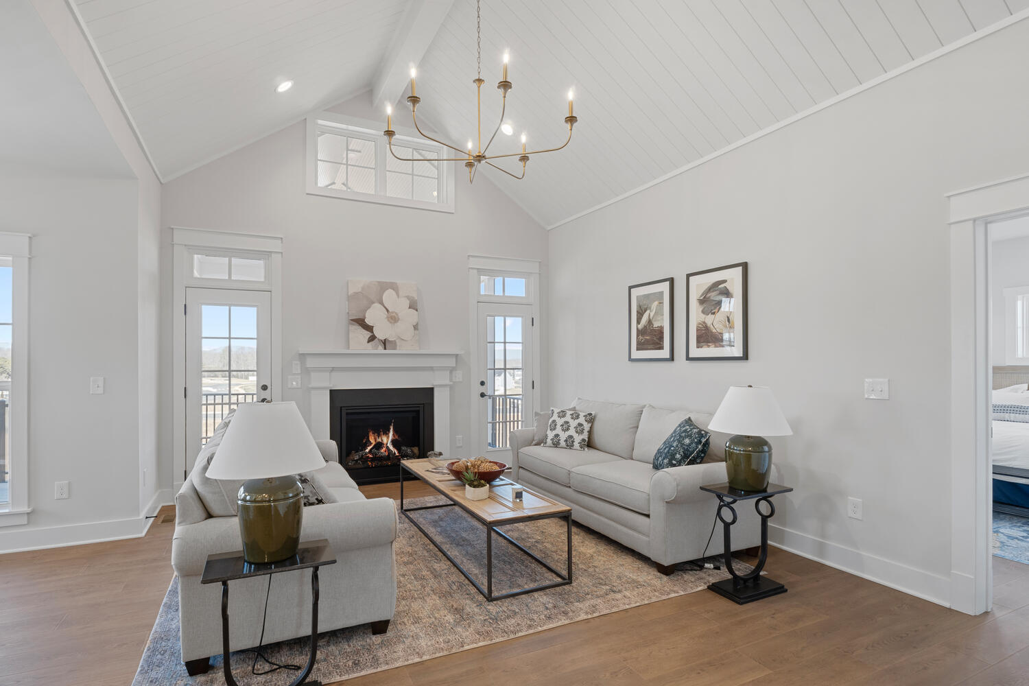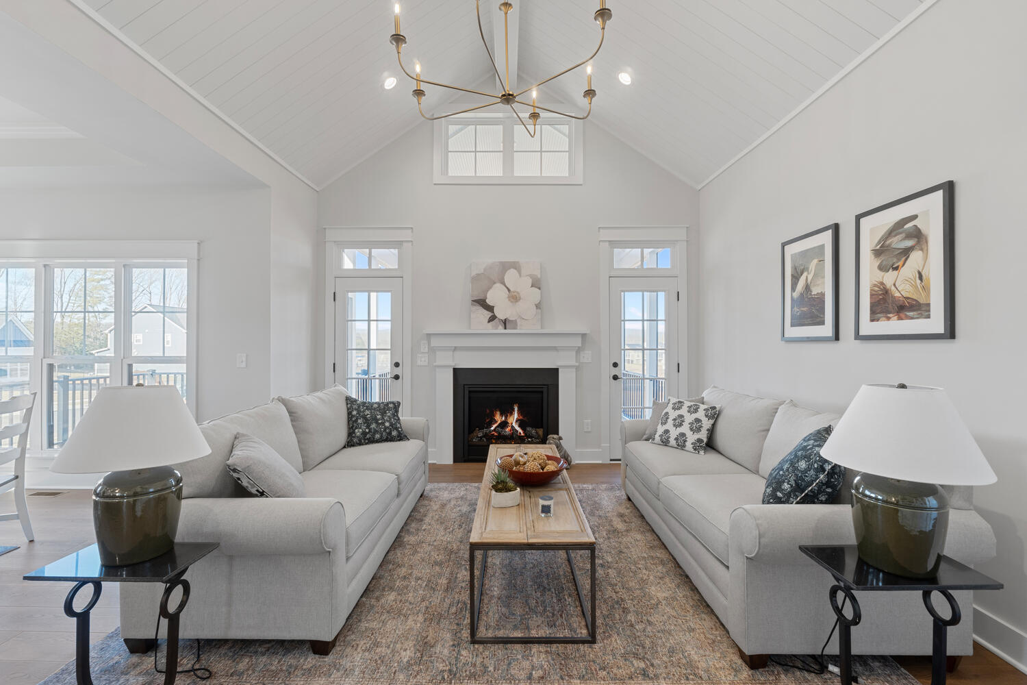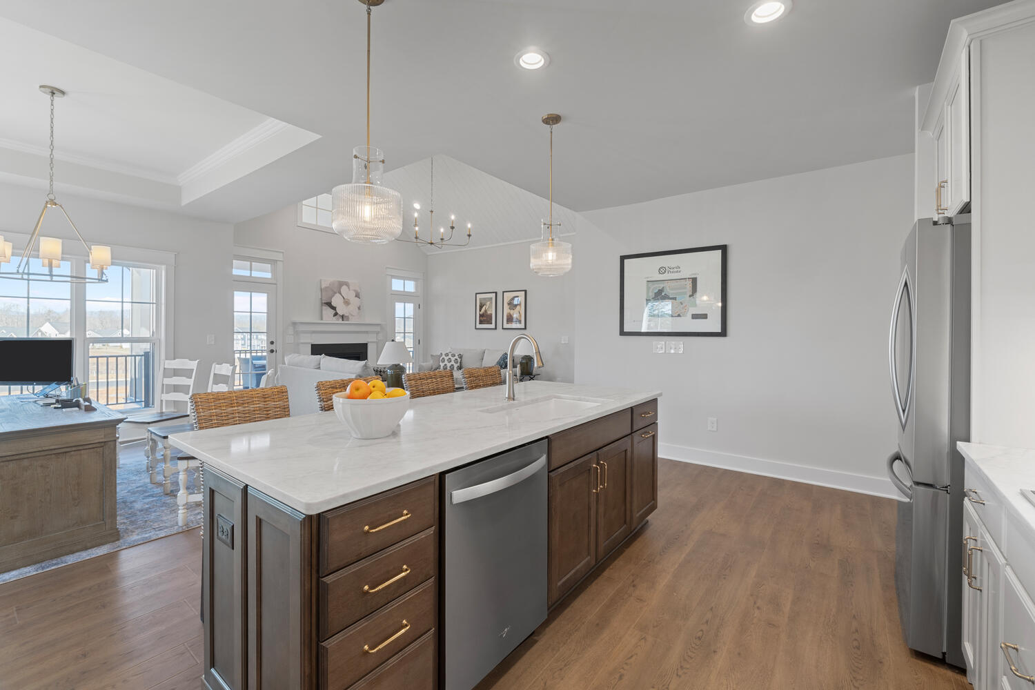 The Great Room, with its distinctive vaulted ceiling, is the focal point of the home. It is filled with natural light and boasts a fireplace and optional built-in bookshelves.