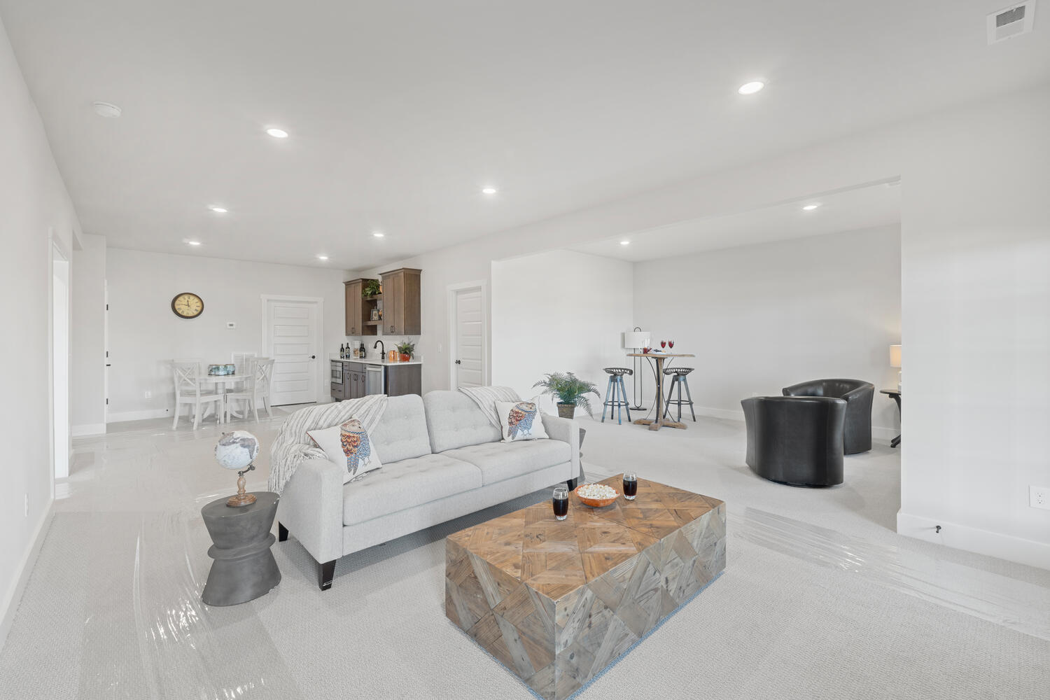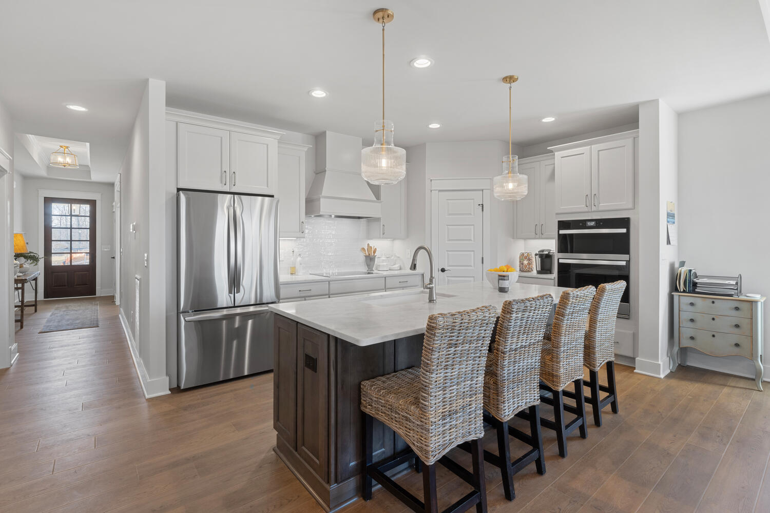 Enter the open Foyer and you’ll find two gracious Bedrooms with large closets and shared full Bath. A beautiful open concept Dining Room adjoins the Kitchen and Great Room.
